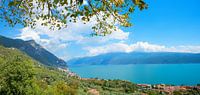 prachtig uitzicht op het Gardameer, westkant, vanaf uitkijkpunt Bogliaco, italiaans herfstlandschap. takken met bladeren