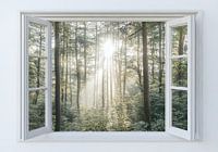 digitaal fictief beeld van een woning met witte muur met venster dat uitkijkt op het bos