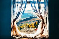 Digitaal schilderachtig beeld van een doorkijk door het raam met zicht op een prachtig landschap