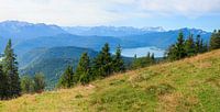uitzicht vanaf de berg Hirschhornl op de Beierse Alpen en de Walchensee. wandelbestemming in de zomer