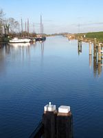 Uitzicht bij Garnwerd in de provincie Groningen over het water met boten en een stijger.Het was een mooie zonnige maar koude dag in Januari. Het Pieterpad loopt ook langs deze mooi lokatie.