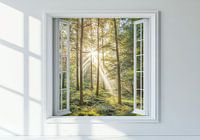 digitaal fictief beeld van een woning met witte muur met venster dat uitkijkt op het bos