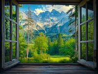 het prachtige uitzicht op een landschap in heldere kleuren vanuit het raam of balkon