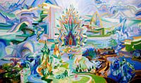 Moderne kunst van een artistiek landschap met architectuur en veel vrolijke kleuren.