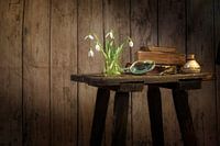 vaas met sneeuwklokjes, boek en andere oude voorwerpen op een vintage krukje tegen een donkere rustieke houten wand, veergroetstilleven met kopieerruimte, geselecteerde focus