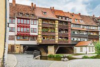 Uitzicht vanaf de Gotthardtstrasse op de vakwerkhuizen van de Krämerbrücke en de Gera. De Krämerbrücke ligt in de oude stadskern van Erfurt, hoofdstad van de Duitse deelstaat Thüringen, Duitsland, Europa.