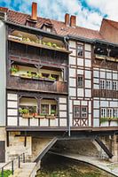 Uitzicht vanuit het zuiden op de vakwerkhuizen van de Krämerbrücke. De Krämerbrücke ligt in de oude stadskern van Erfurt, hoofdstad van Thüringen, Duitsland, Europa.