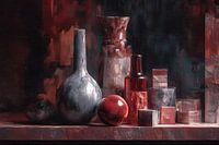 vazen bol | Red Orb - Dit stilleven schilderij toont een modern stilleven met vazen en objecten — een grote matte, ronde grijze vaas links en een glanzende rode bol op de voorgrond naast een rood glazen flesje en kubusvormige blokken, geschilderd in dikke, zichtbare verfstreken met een donker rood-zwart sfeer; stilleven schilderij,…
