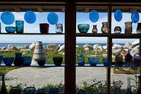 Deze foto is genomen in een glasblazerij met winkel op de Lofoten in Noorwegen. Het glaswerk paste prachtig bij het uitzicht op de blauwe lucht, de zee en de rotsen.