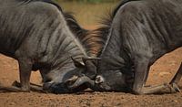 vechtende wildebeest. deze mannetjes gaan de strijd aan voor het paarseizoen. gefotografeerd in zuid afrika