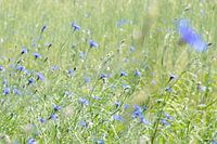 Heel veel korenbloemen (Centaurea cyanus) in een graanveld. De bloemen waaien heen en weer in de wind.