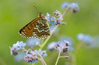de zeer zeldzame veldparelmoervlinder ontwaakt op een vergeetmenietje