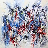 Mijn proces is intuïtief: kleuren vloeien samen, lijnen ontstaan spontaan, en uit die stroom groeit iets wat niet vast te leggen is in woorden. Elk werk is een moment van…