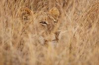 Een leeuw, perfect gecamoufleerd, verborgen in het hoge gras in het Kruger National Park, Zuid-Afrika.