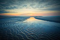 Een winters vergezicht met het strand en de Noordzee nadat de zon bijna onder is onder gegaan. Bijzondere zandstructuren op het Noordzeestrand met het zeewater en het zand.