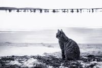 Een kat zit op het strand en kijkt verlangend naar het water.