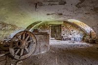 Een kapotte waterput in de kelder van een verlaten paleis in Italië. Het Licht komt via een klein raampje naar binnen en licht een verroeste kapotte fiets uit.