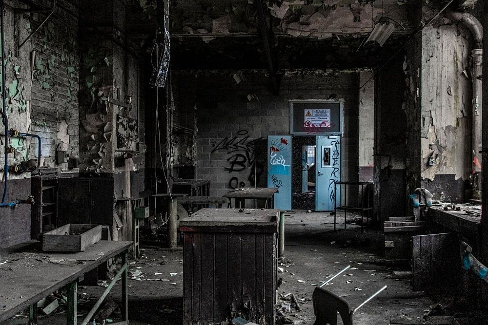 in een voormalige staalfabriek ligt de werkplaats er verlaten bij.