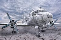 eine alte Propellermaschine in metallischem Glanz auf wüstenartigem Untergrund