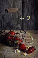 Aardbeien vers geplukt in een mand, ingericht voor een stilleven met bloemen