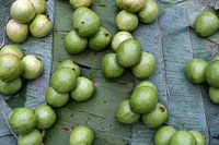 Op elke straathoek in oud Kolkata (Calcutta) zitten verkopers van groenten en fruit.Vers fruit dat vaak bananenblad als onderligger heeft. Goedkoop en milieuvriendelijk. Een kleurig palet.