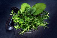 verse kruiden, oregano, rozemarijn en salie in een vijzel met stamper van zwart graniet op een donkere leistenen achtergrond, uitzicht van bovenaf, geselecteerde focus, smalle scherptediepte