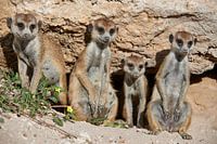 vier grappige stokstaartjes, Suricata suricatta, Kgalagadi Transfrontier Park, Kalahari, Zuid-Afrika, Botswana, Afrika