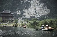 vietnamese kooplui met op achtergrond tempel. Bootjes met kooplui in Phong Nha-Ke Bang National Park. Krijtrotsen en tempel