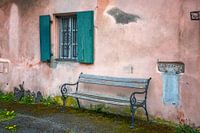 In het mooie stadje Kaysersberg stuitte ik op dit bankje. Verveloos en verwaarloosd net als de luiken en de omgeving maar wat een schilderachtig plekje. Een paar paardebloemen voor een pittig kleurtje tegen de roze muur.