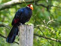 De vogel is ongeveer 50 cm lang en weegt gemiddeld 360 gram. Het is een onmiskenbare vogel, merendeels glanzend violetkleurig waarbij afhankelijk van de lichtval de vogel heel donker of tegen groen aan kan lijken. In zit is het rood op de vleugels nauwelijks te zien, maar als de vogel opvliegt, contrasteren karmijnrode vleugelveren met het donkerblauw van de vleugeldekveren. Verder heeft deze toerako een grote, dikke rode snavel, voor op de kruin geel en daarachter weer rood, met ook rond het oog een rode ring. De iris is donkerbruin.