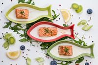 tablefood opname van een schaaltje met een stukje zalm in heerlijke roomsaus. met wat groente erbij