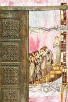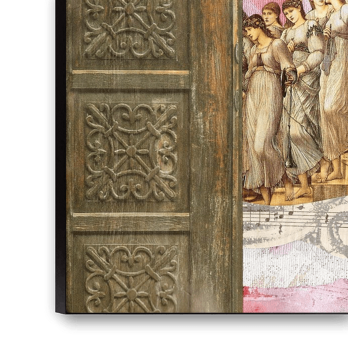 collage op geverfde stof van afbeeldingen en gelli print op bladmuziek