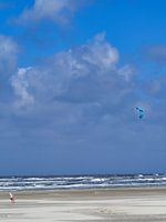 Een flinke rukwind trekt deze jonger vliegeraar in de lucht zodat hij met zijn kite zeilt op de wind op het strand van het Waddeneiland Terschelling bij Midsland aan Zee.