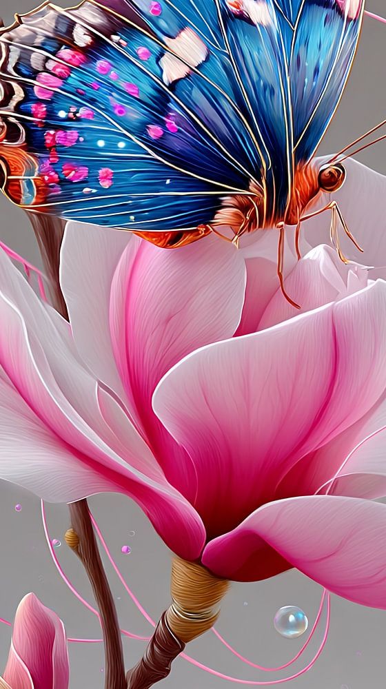 Op een kalme tak ontmoet het vluchtige het vaste: een vlinder landt voorzichtig op een magnoliabloem.