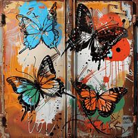 Dit werk vangt de fragiele schoonheid van vlinders afgebeeld op een verweerd, stedelijk oppervlak. De levendige kleuren van de vlinders en de abstracte verfspatten vormen een schril contrast met de roestige tinten en graffiti-elementen. De scène ziet eruit als een surrealistische droom waarin de natuur de stedelijke wildernis ontmoet. De vlinders, symbolen van transformatie en schoonheid, worden een gedenkteken voor de veerkracht van de natuur in een door de mens gemaakte omgeving.