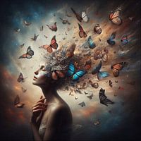 Wat een surrealistisch beeld wordt hier geschetst, de vrouw op dit portret met allemaal vlinders om haar heen, de vlinders lijken verweven in het haar en vliegen overal rond haar heen, De kleuren springen uit het werk en dat maakt dit gekke portret ook weer vrolijk en uniek, wat een genot om naar te mogen kijken, en wat een vervreemdend beeld.