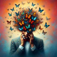 Wat een surrealistisch beeld wordt hier geschetst, de man op dit portret met allemaal vlinders om hem heen, de vlinders lijken verweven in het haar en vliegen overal rond hem heen, De kleuren springen uit het werk en dat maakt dit gekke portret ook weer vrolijk en uniek, wat een genot om naar te mogen kijken, en wat een vervreemdend…