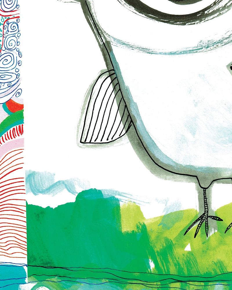 Beginnend met willekeurige klodders inkt en verf verscheen uiteindelijk deze vogel. Er zit groen en turquoise en wat rood in. Niet te veel kleuren, maar toch is er een vrolijke vibe.