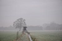 landschap in Lintelo, Achterhoek, Gelderland, waar een vogelkijkhut in een mistig winters weiland langs een slootje staat