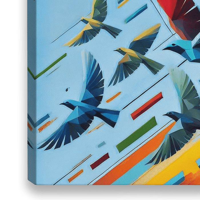 De graphic toont een digitaal gecreëerde compositie die de kijker meteen een gestileerde wereld in trekt. De achtergrond is een intense, helderblauwe lucht die dient als kalmerende basis. In deze duidelijk afgebakende ruimte vliegen hoekig getekende vogels, waarvan de vormen geometrisch en abstract lijken. Ze bewegen in één richting en…