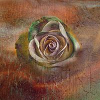 Fotografie van een roos digitaal verwerkt met textuur. Bruine en oranje tinten domineren het beeld.