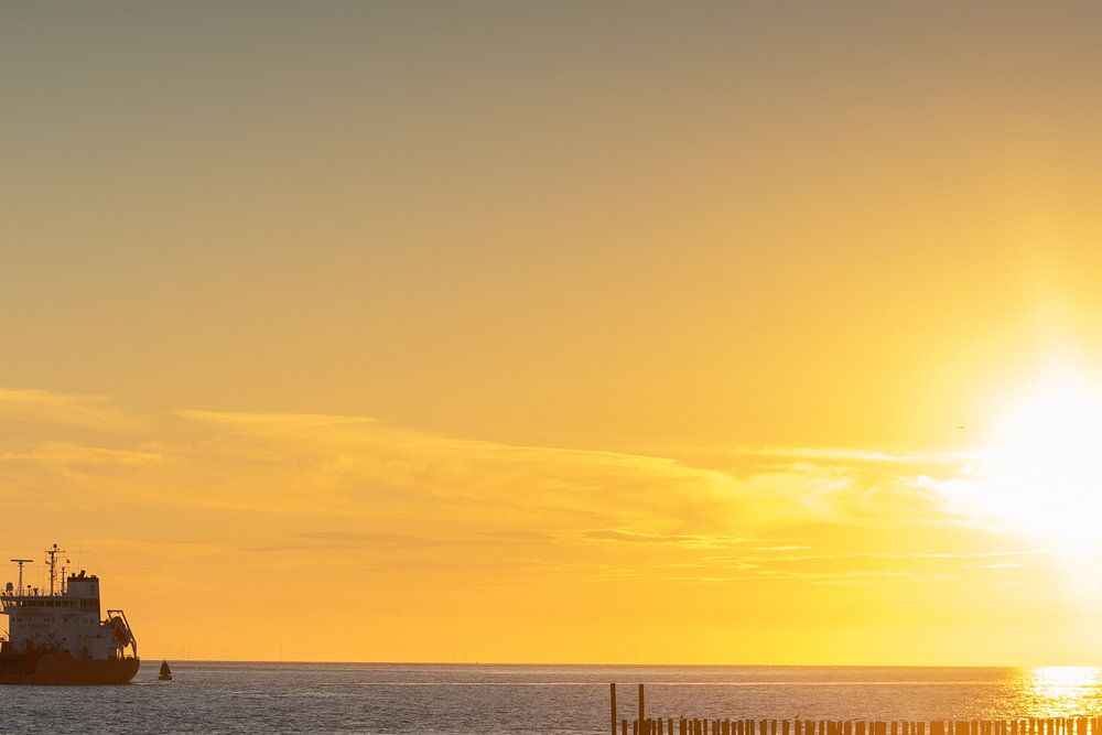 Scheepvaart gaat 24/7 door. Deze foto is gemaakt op het strand bij Dishoek in Zeeland. Op de foto vaart een vrachtschip bij zonsondergang. De paalhoofden zorgen voor een compleet beeld.