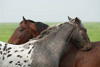 twee paarden die elkaar aan het aftasten zijn nadat zij een half jaar op stal hebben gestaan. Dit gebeurde in het Buitengebied in noord friesland