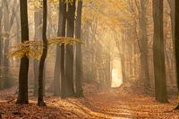 vroege herfstochtend in het bos. De mist trok weg en de zon kwam langzaam de aarde verwarmen