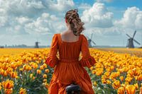 vrouw in rode jurk fietst door een tulpenveld in een typisch hollands landschap