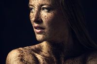 Foto van naakte vrouw onder de viezigheid met erg hoog detail. De meid is bloot als pin-up, zit onder het gruis en haar schouder en gezicht zijn zichtbaar.