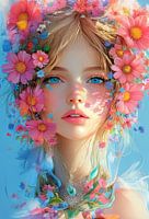 schilderachtig digitaal fictief portret van vrouw met bloemen in metropolitan stijl