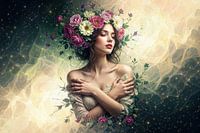 schilderachtig fotorealistisch beeld van fictieve vrouw met bloemen in een fantasiewereld