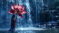 digitale spirituele schilderachtige afbeelding van fictieve mediterende vrouw met lotusbloemen en water