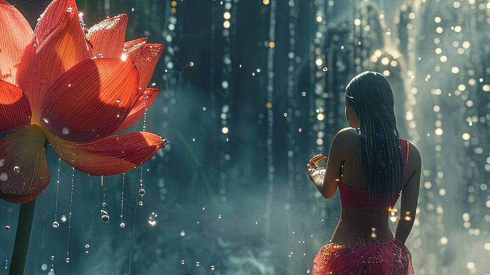 digitale spirituele schilderachtige afbeelding van fictieve mediterende vrouw met lotusbloemen en water